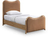 Sleek lines and soft curves come together in the Arvada vegan leather upholstered bed, where warm tones and a sculptural silhouette create a modern yet timeless centerpiece. Wrapped in smooth vegan leather and supported by a solid wood base in a natural finish, this bed balances comfort and craftsmanship with ease. Perfect for adding a grounded, organic feel to any bedroom.