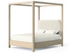 Airy and architectural, this canopy bed brings sculptural presence and soft romance to the bedroom. Gracefully arched posts frame a tall silhouette, while an upholstered headboard adds a tailored layer of texture and comfort. Designed with a platform panel base, it offers lasting support without the need for a foundation. Crafted from mahogany, engineered wood, mango veneer, and fabric, this piece blends strength and serenity in perfect harmony.