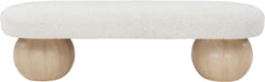 Elevate your home decor with this stunning Bowie Boucle Fabric Bench. The rich boucle fabric gives it a luxurious and sophisticated look that is sure to catch the eye of guests. The natural finish on the solid ash wood ball-shaped legs adds a touch of warmth and elegance to the piece. Whether you're using it as a stylish seating option in your living room or as a chic accent piece in your bedroom, this bench is sure to impress.