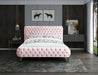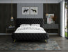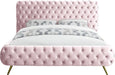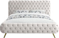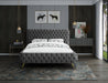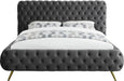 Surround yourself in modern luxury when you add this Delano Bed to your bedroom oasis. Sumptuous by design, this bed features all-over button tufting for a look that is nothing short of stunning. This dimensional bed features a heavily padded headboard and side rails, each covered in magnificent-to-the-touch velvet for a look that's upscale and simply divine. Metal legs on this bed allow easy clearance for vacuuming, and the bed uses just a mattress, so there's no need for a box spring or foundation, which only adds to its sleek look.