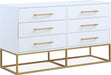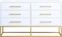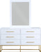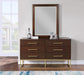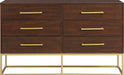 Inject bold, modern styling into your bedroom with this Maxine dresser. The dresser's contemporary design is nothing short of stunning, with unassuming lines and eye-grabbing hardware. A rich finish is modish and up-to-the-minute, while the brushed metal legs and drawer handles give this unit added flair. A metal base raises the dresser from the floor for a noticeably upscale vibe. Fill this dresser's drawers with essentials for keeping your bedroom space clean and neat.
