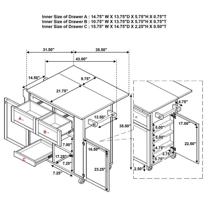 Make your kitchen as functional and fashionable as possible. With a bright modern farmhouse motif, this kitchen cart organizes tasks and storage options into one central unit. Solid rubberwood offers a stylish composition that shows off a butcher block work surface. Fresh white and natural brown finish deliver decor versatility. Keep tasks simple with a towel rack, spice rack, a hidden cabinet for trash, and casters for portability.
