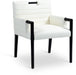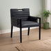 A perfect fusion of modern elegance and eco-friendly luxury is the Aimee vegan leather dining armchair. Upholstered in sleek vegan leather, this chair offers a chic, contemporary look while maintaining a commitment to sustainable living. The padded, quilted design featuring solid black wood legs and armrests creates a stunning contrast between its soft upholstery and minimalist frame.