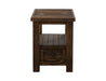 1 Drawer Table. The Dutton Occasional Tables Collection is a masterpiece of country cottage style, symbolizing stability and rootedness in an ever-changing world. Designed with both style and utility in mind, these tables feature visible wood grain and natural knots that add texture and authenticity to each piece. The rich brown stain highlights the beauty of the wood while enhancing its rustic and timeless appeal. The chairside table features one drawer and one open shelf. This clever design enhances functionality while keeping the space organized.