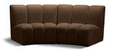Create a seating group that works for every possible situation with this Infinity modular love seat and other pieces in the Infinity collection. Upholstered in soft Brown velvet material that feels great against the skin and offers long-wearing beauty, this piece fits with other Infinity items for an infinite number of combinations that get your seating requirements just right but that look just as nice when used on their own.