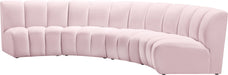 Create a seating group that works for every possible situation with this Infinity modular 4-piece sectional and other pieces in the Infinity collection. Upholstered in soft velvet material that feels great against the skin and offers long-wearing beauty, this piece fits with other Infinity items for an infinite number of combinations that get your seating requirements just right but that look just as nice when used on their own.