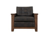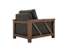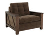 The Walnut armchair features a sturdy wooden frame with a rich brown finish and wide, flat armrests. Both the seat and backrest are upholstered with durable and textured fabric. The backrest showcases a tufted design adorned with buttons. This piece features a solid wood frame and legs, adding an elegant touch. Diagonal wooden supports on the sides enhance its modern rustic charm, blending the warmth of wood with the sleekness of brown upholstery.