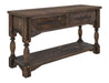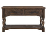 2 Drawer, Console. The Dutton Sofa Console combines elegance and simplicity. It represents stability in a changing world and brings a sense of peace and connection. This console, made from various wood species, boasts unique grain patterns and is designed for durability. Its lightly distressed surface features a brown lacquer finish that highlights the natural beauty of the wood. The console has elegantly turned legs that add a classic touch. It also offers two spacious drawers adorned with unique custom metal pulls, finished with a matte powder coating to resist chipping. The console features a lower shelf for extra storage or display, making it perfect for books, decor, or other essentials. Enhance your living space with the Dutton Sofa Console, where exquisite design meets practical functionality, creating a tranquil and stylish environment.