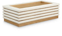 Put emphasis on style when you add this Rory coffee table to your current setup. This handsome table features a stacked look with soft vegan leather accents against a natural finish oak veneer. The look of leather and oak forms an exciting contrast that's not lost on guests or others. A lip across the top of the table keeps things from sliding off, and its retangle shape makes it ideal for adding alongside a corner sectional or other large seating group.