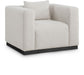 Make this Alfie linen textured fabric living room chair the center a cozy reading nook. This overstuffed chair is stunning from angles, with its contemporary design elements and chic rich color. Plumply stuffed with fluffy fill to create the ultimate space for snuggling up with your favorite reading material or while binging on the latest TV program. The chair rests on a black finish solid wood base for stability and added contrast with its beige upholstery.