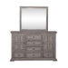 Live life beautifully with the Big Valley dresser and mirror. Crafted of rubberwood solids with birch veneers this kit features a brownstone finish with heavy distressing, wood framed doors and drawers, graduated bead molding creating architectural interest, square pilasters and block feet, full extension drawers with premium felt lined top and cedar lined bottom drawers, and is accented with antique pewter knob hardware. The dresser has six drawers and two doors, with an adjustable shelf behind each door. The beveled edge mirror can be attached to the dresser using the included bolt-on supports. Warm antique finishes and artistic distressing along with grand scale makes the Big Valley a group to be passed on to generations.