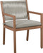 Make your outdoor oasis even more inviting with this Maui Outdoor Patio Dining Arm Chair. Crafted with an aluminum frame to look like teak without the maintenance requirements, this dining arm chair offers both style and convenience. Its resilient fabric cushions are water-resistant and plump and have quick-dry foam inserts. With its contemporary resort look, this chair adds sophistication to any patio, porch, or deck setting. Embrace the essence of outdoor comfort and style with this elegant addition-your perfect companion for leisurely moments outdoors.