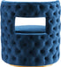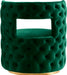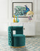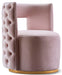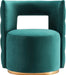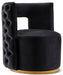 Complement your contemporary decor with this Theo Accent Chair from Meridian Furniture. Featuring a contemporary design with button tufting on the back, this chair is sure to immediately draw the eyes of all who enter your home. velvet upholstery makes this chair luxurious to sit in, and the opening in its back ensures ample air flow while you curl up with your favorite book or in front of the TV. Its swivel base accentuates its velvety dark color, while allowing you to turn whichever way you choose as you recline.